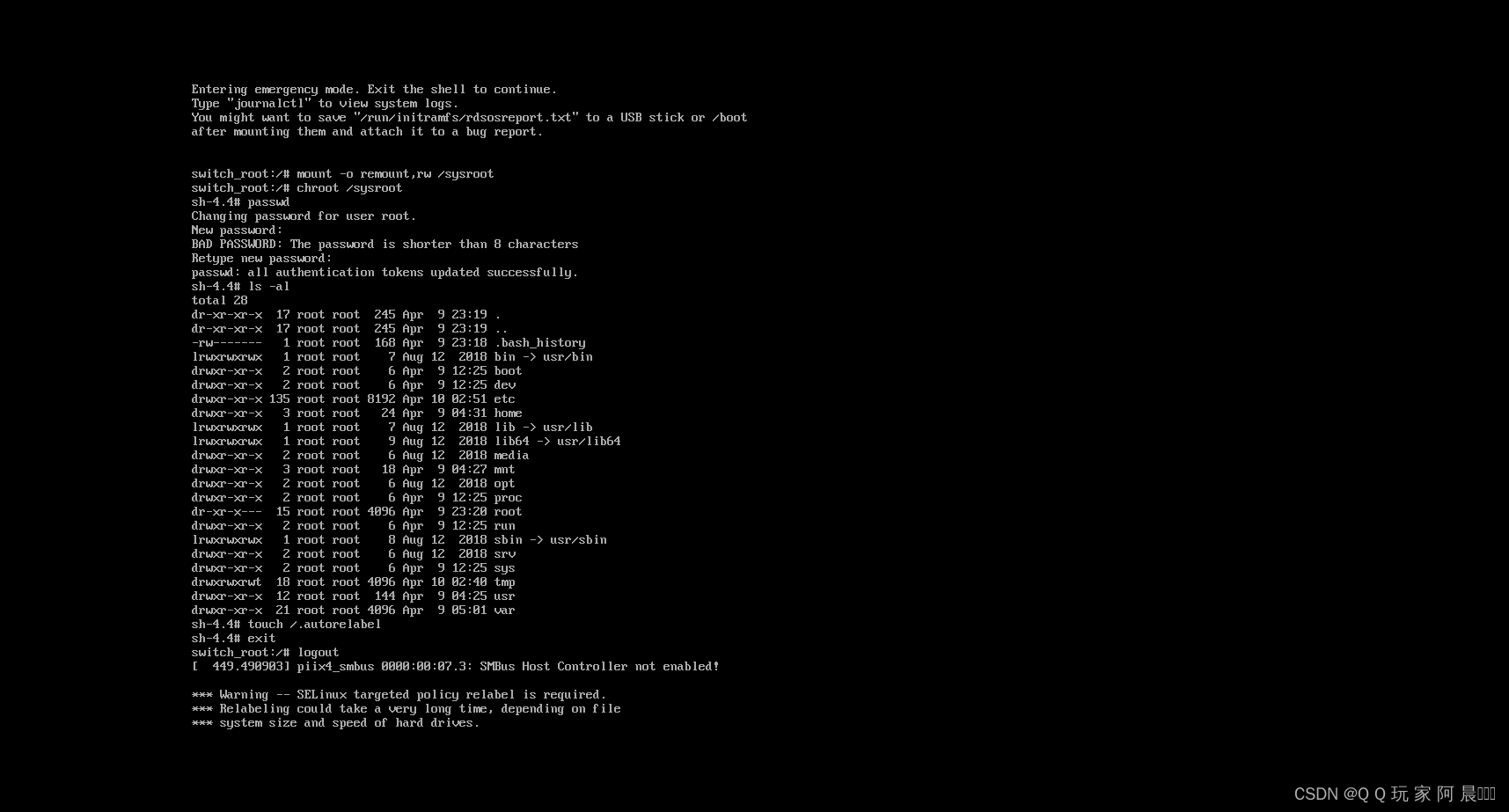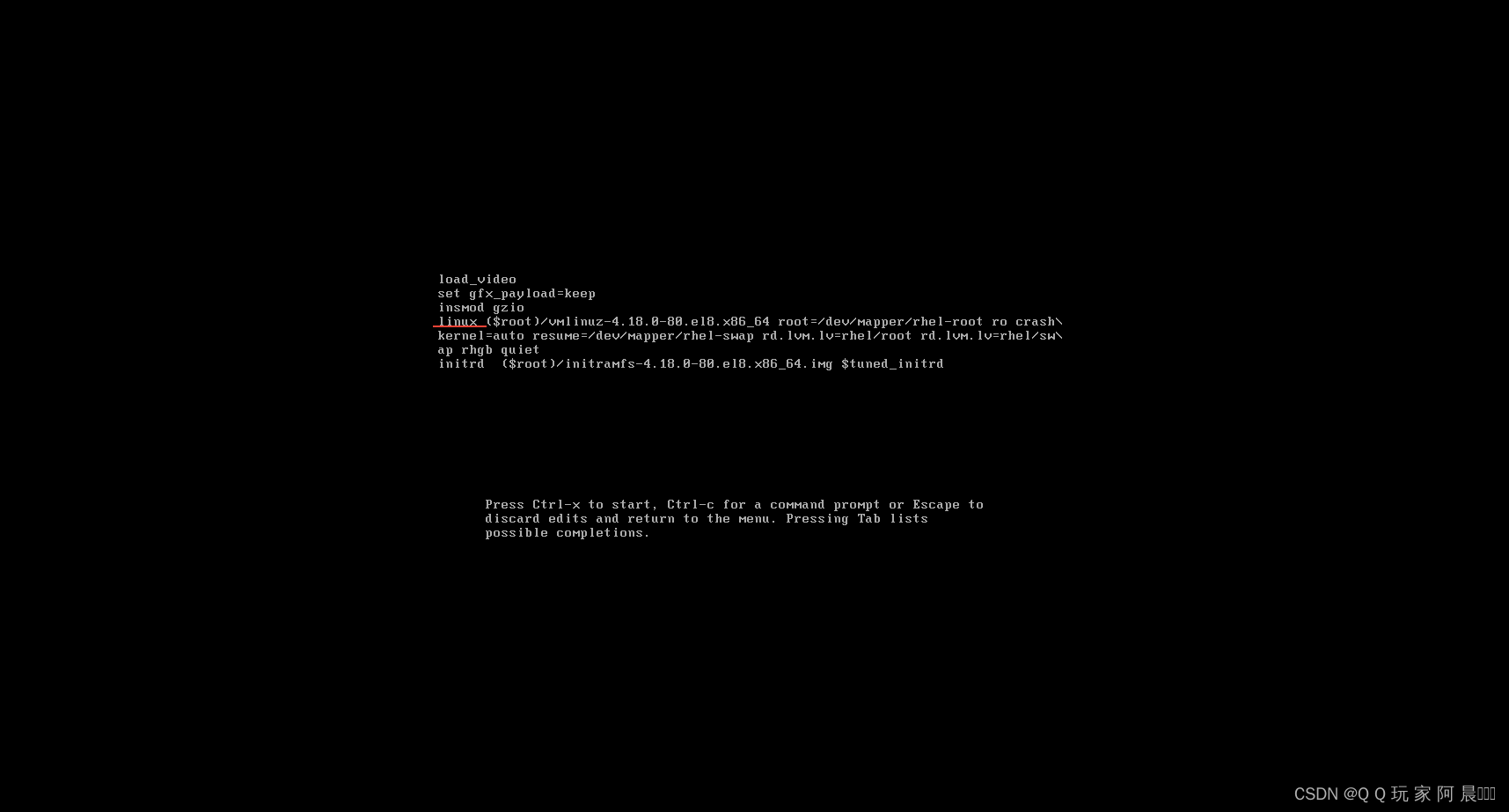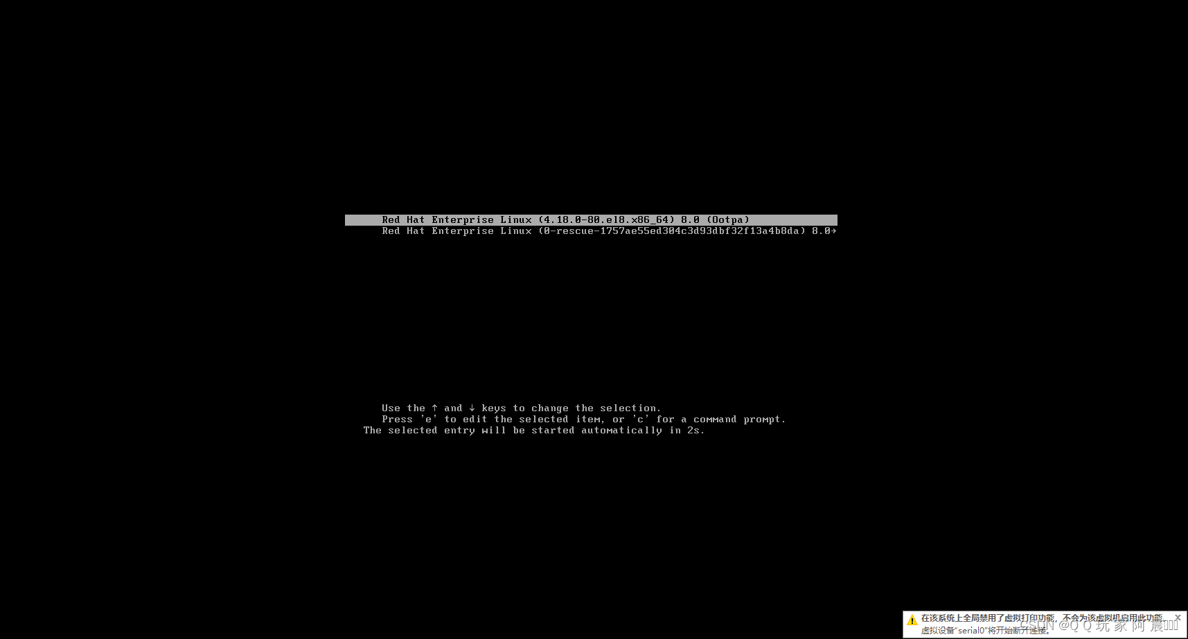 先查看系统版本:cat /etc/redhat-release显示 Red Hat Enterprise Linux release 8.0 (O0tpa)注:chentos7和redhat7,8都适用(作者亲测)现在开始教程:第一步:打开虚拟机在这个界面输入E,将进入下图(不同的型号,进入的界面不同)找到Linux,将鼠标移到末尾添加rd.break(只要在Linux这句话里面位置任意,建议放末