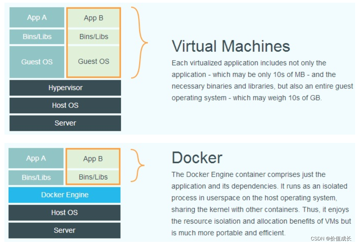 虚拟机Virtual Machine与容器化技术(代表Docker)都是虚拟化技术,两者的区别在于虚拟化的程度不同。