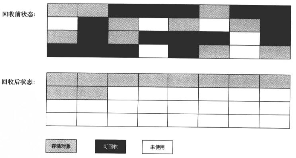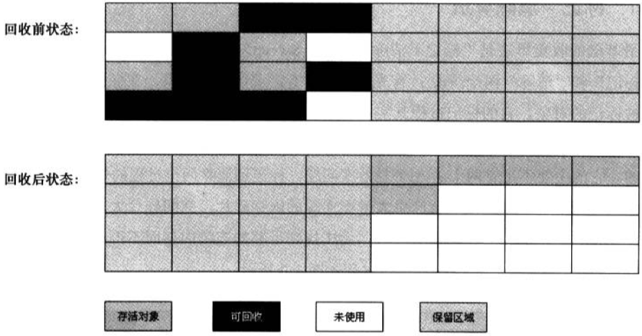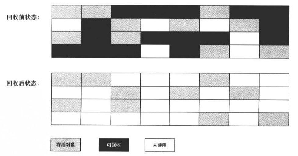 标记—整理算法的标记过程与标记—清除算法一样,当标记完需要被回收的对象后,将依然存活的对象都向一端移动,然后直接清除掉端边界以外的所有内存。标记—整理算法的过程如下: