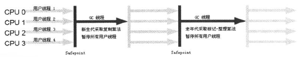 Serial收集器是一个单线程的收集器,“单线程”并不是指仅仅只会使用一个CPU或者一个线程去完成垃圾收集工作,更重要的是它在进行垃圾收集时,必须暂停其他所有的工作,直到垃圾收集结束。Serial和Serial Old收集器的运行过程如下图所示: