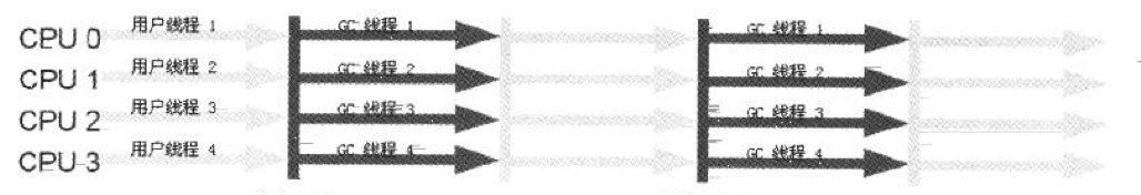 ParNew收集器其实就是Serial收集器的多线程版本,除了使用多条线程进行垃圾收集外,其余行为包括Serial收集器可用的所有控制参数(如:-XX:SurvivorRatio、-XX:PretenureSizeThreshold、-XX:HandlePromotionFailure等)、收集算法、Stop The World、对象分配规则、回收策略等都与Serial收集器完全一样。ParNew收集器的运行过程如下图所示:![]()