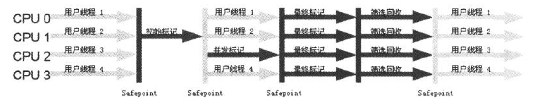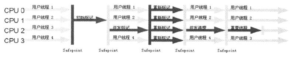 CMS收集器是一种以获取最短回收停顿时间为目标的收集器。从名字可以看出CMS收集器是基于标记—清除算法实现的并发收集、低停顿的垃圾收集器,所以也被称为并发收集低停顿收集器,其运行过程可以分为4个阶段:① 初始标记② 并发标记③ 重新标记④ 并发清除其中,初始标记和重新标记仍然需要Stop The World。初始标记仅仅是标记一下GC Roots能直接关联到的对象,并发标记阶段就是进行GC Roots Tracing的过程,重新标记是为了修正在并发标记阶段由于用户程序继续运行而导致标记发生变化的那一部分对象的标记记录。由于整个垃圾收集过程耗时最长的并发标记和并发清除过程可以与用户线程并发执行,所以从总体上来说,CMS收集器的内存回收过程是与用户线程并发执行的。CMS收集器的运行过程如下图所示:![]()