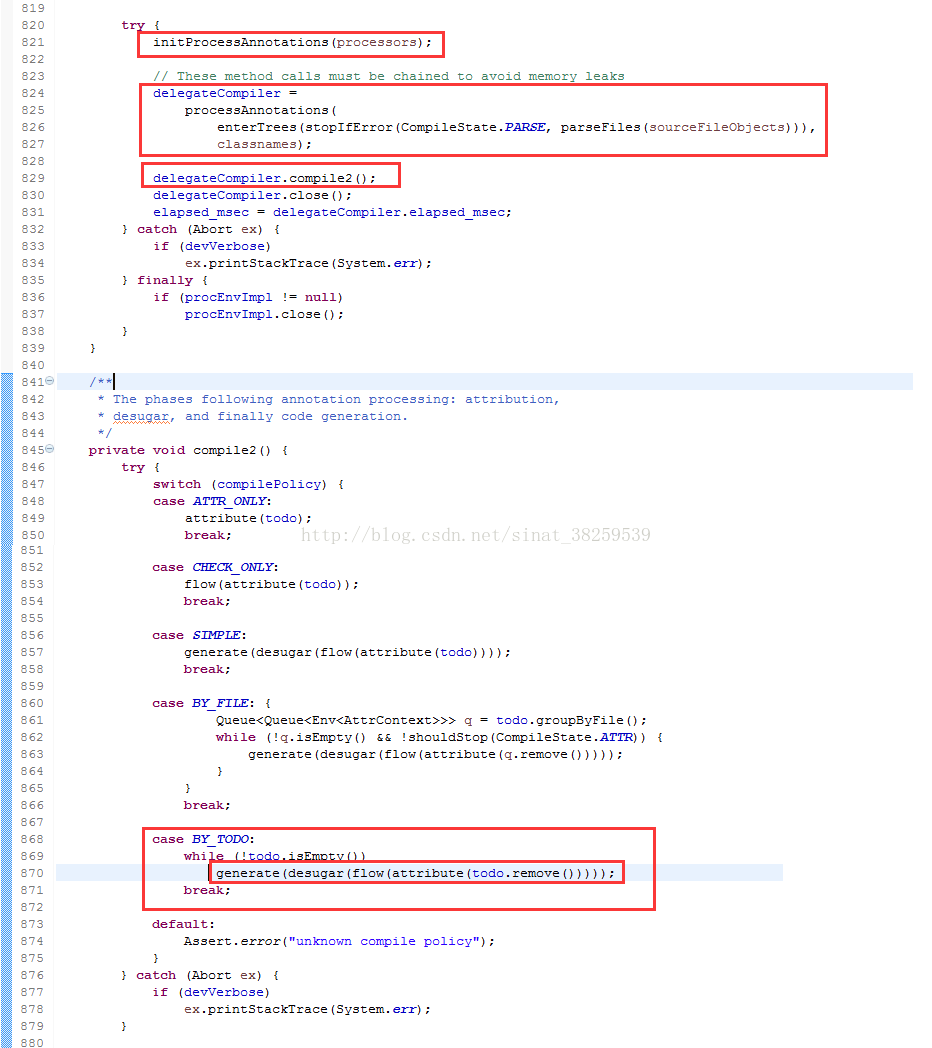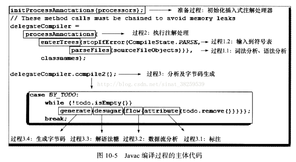 Javac 编译动作的入口是 com.sun.tools.javac.main.JavaCompiler 类,上述 3 个过程的代码逻辑集中在这个类的 compile() 和 compile2() 方法中,其中主体代码如图 10-5 所示,整个编译最关键的处理就由图中标注的 8 个方法来完成,下面我们具体看一下这 8 个方法实现了什么功能。