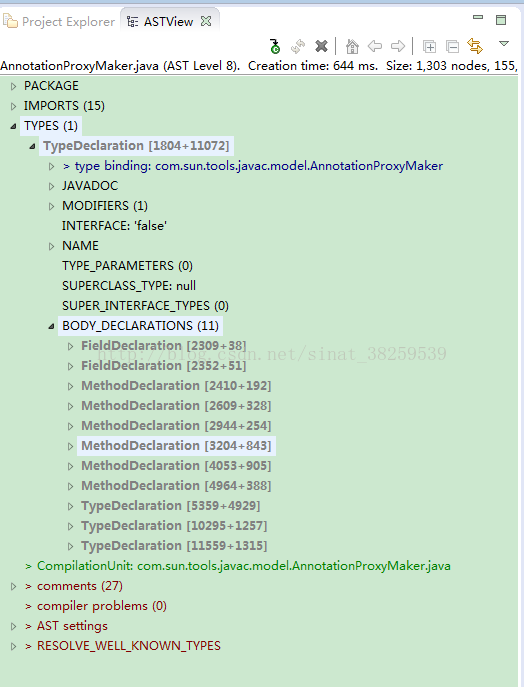 图 10-6 是根据 Eclipse AST View 插件(地址:http://www.eclipse.org/jdt/ui/astview/index.php)分析出来的某段代码的抽象语法树视图,读者可以通过这张图对抽象语法树有一个直观的认识。在 Javac 的源码中,语法分析过程由 com.sun.tools.javac.parser.Parser 类实现,这个阶段产出的抽象语法树由com.sun.tools.javac.tree.JCTree 类表示,经过这个步骤之后,编译器就基本不会再对源码文件进行操作了,后续的操作都建立在抽象语法树之上。