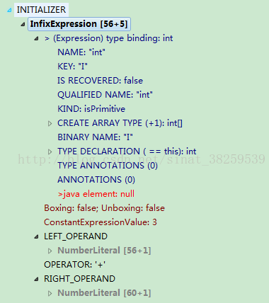 那么在语法树上仍然能看到字面量 “1”、“2” 以及操作符 “+”,但是在经过常量折叠之后,它们将会被折叠为字面量 “3”,如图 10-7 所示,这个插入式表达式(Infix Expression)的值已经在语法树上标注出来了(ConstantExpressionValue:3)。由于编译期间进行了常量折叠,所以在代码里面定义 “a=1+2” 比起直接定义 “a=3”,并不会增加程序运行期哪怕仅仅一个 CPU 指令的运算量。