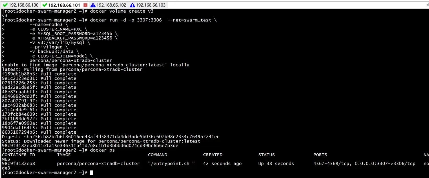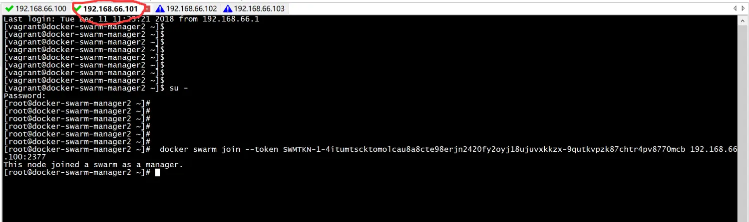 | docker-swarm-manager2 | 192.168.66.101 | docker-swarm-manager2 | 单核 2g内存 | docker-swarm-manager2 | docker |