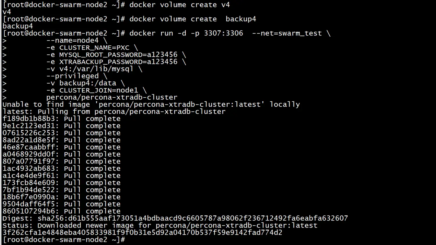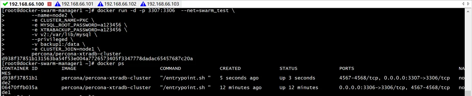 创建2个容器。之前也说过如何创建,最为重要的是共享网络一定要使用swarm的共享网络。