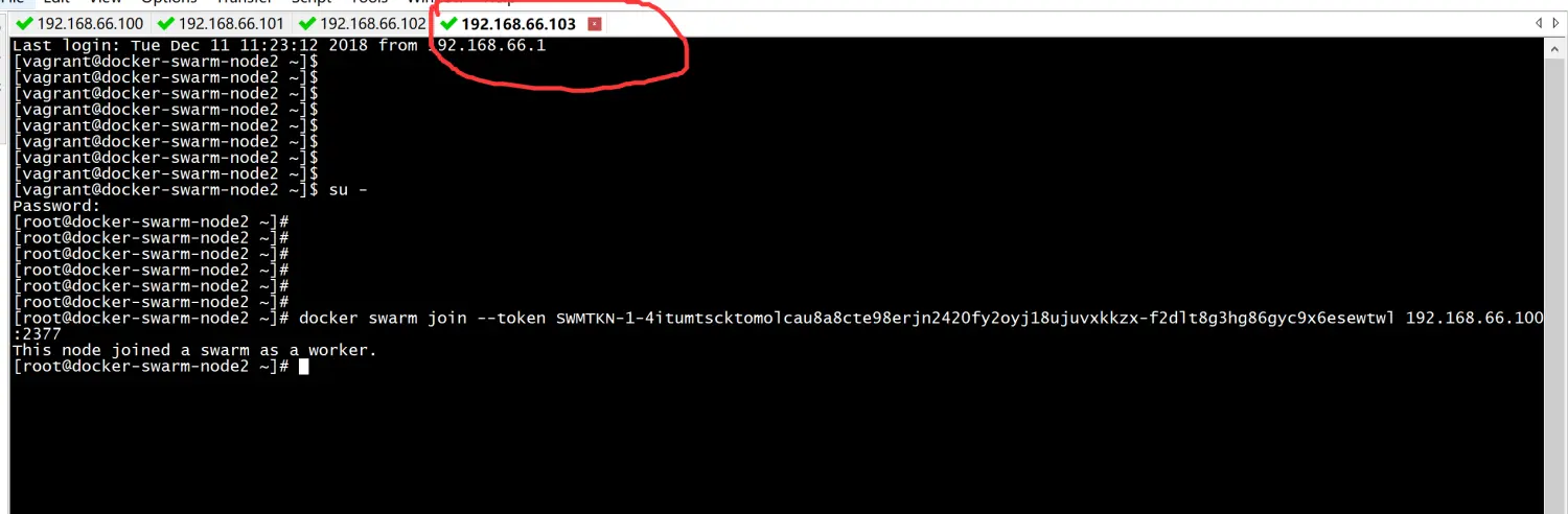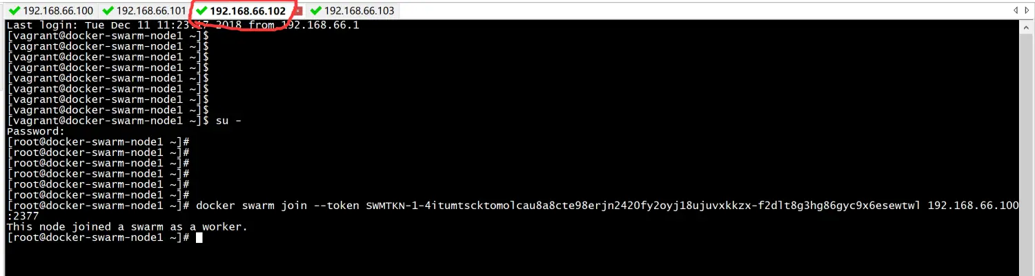 docker swarm join --token SWMTKN-1-4itumtscktomolcau8a8cte98erjn2420fy2oyj18ujuvxkkzx-f2dlt8g3hg86gyc9x6esewtwl 192.168.66.100:2377