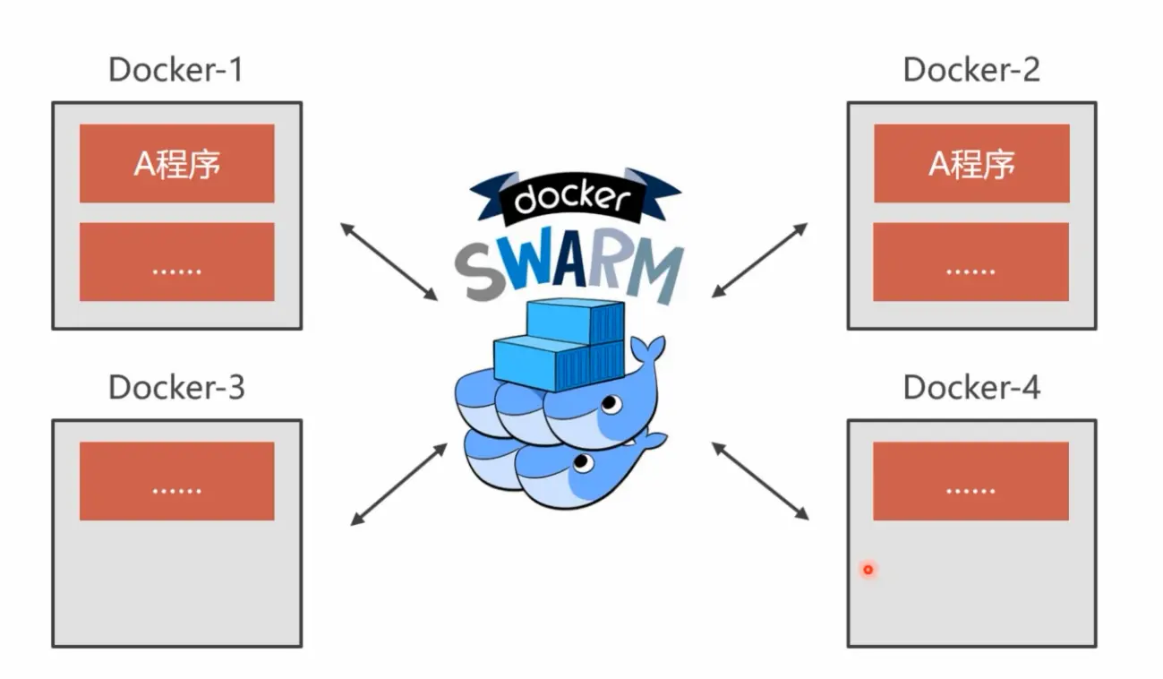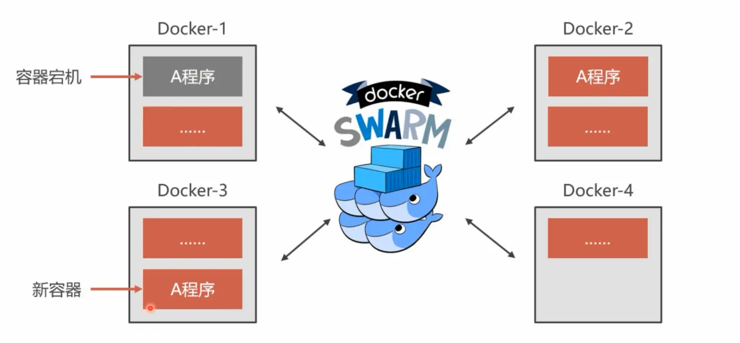 在这个示意图里面,画了4个linux的主机,都安装了docker虚拟机,假如我现在想安装A程序,直接选择Docker-1这个主机里面的容器安装A程序,这样没有问题。但是单节点单容器来部署,一旦这个节点挂掉的话,A程序就没有,为了防止这样我们有冗余设计,直接在Docker-2这个主机里面的容器也安装A程序,这样的话,Docker-1里面的A程序挂了,Docker-2里面的A程序也可以运行。这个功能有点像负载均衡,其实真的很像。docker swarm提供的东西跟负载均衡还是有区别的。swarm 只是提供了容器状态的管理,如果Docker-1里面的A程序挂了,发现本来二个,现在变成1个了危险,立马在起一个吧。实时保证docker容器内的数量。