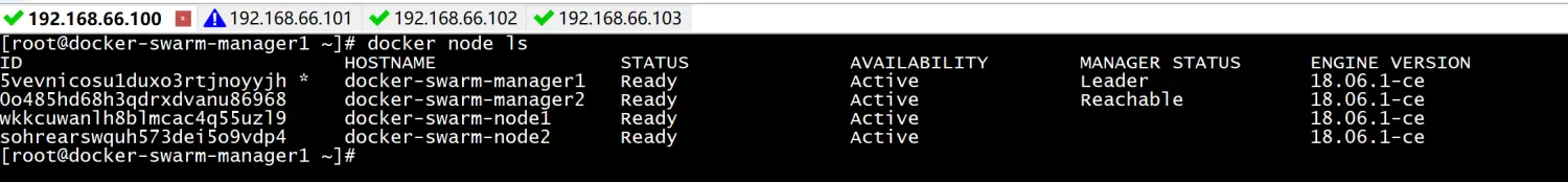 | docker-swarm-manager1 | 192.168.66.100 | docker-swarm-manager1 | 单核 2g内存 | docker-swarm-manager1 | docker |