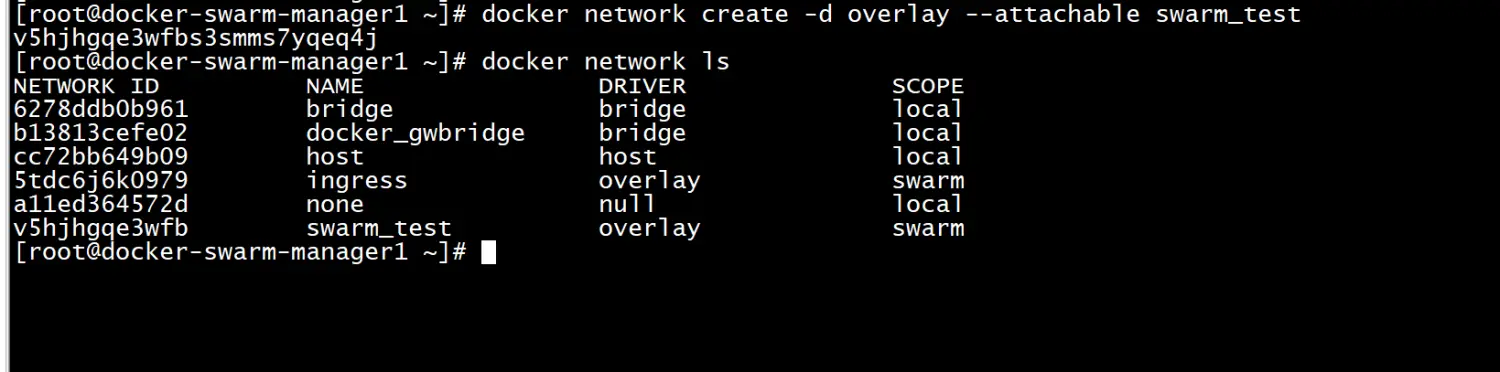 目前是4台机器,如果想让4台机器内的容器可以进行共享,overlay的网络就可以了,只需要在创建容器的时候–net=swarm_test