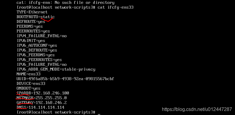 vi /etc/sysconfig/network-scripts/ifcfg-ens33 添加红色标注