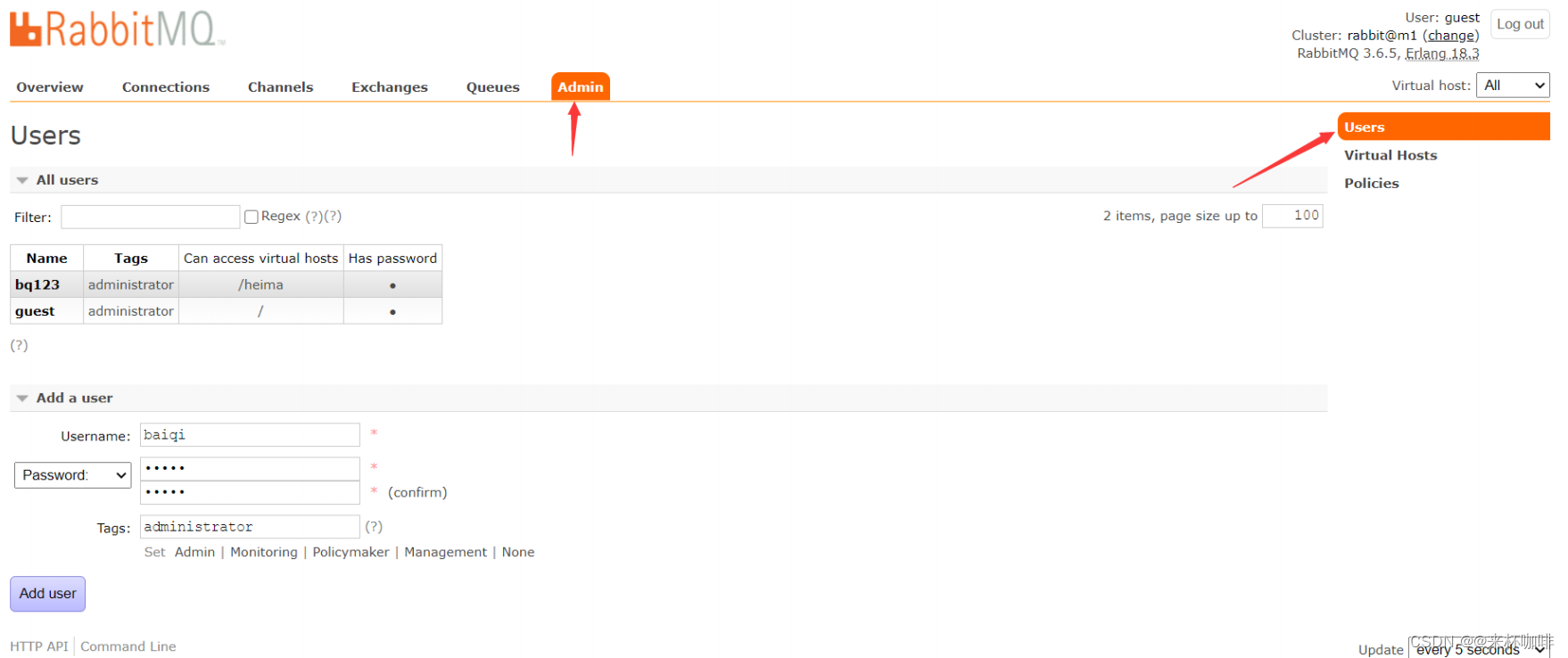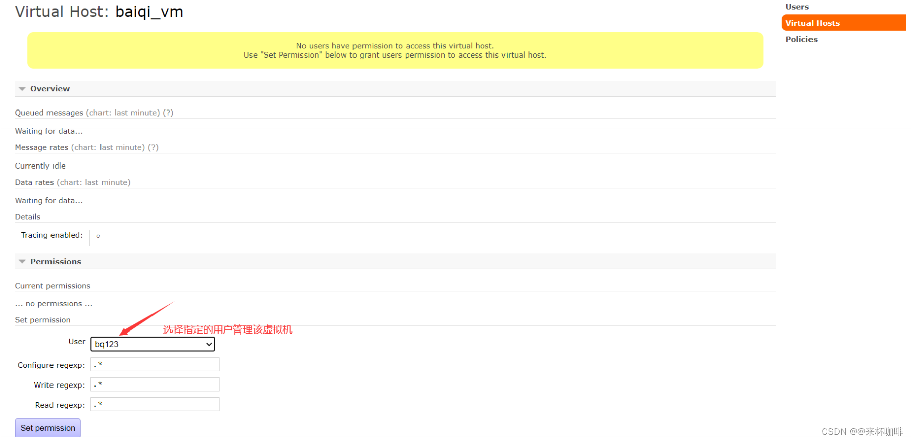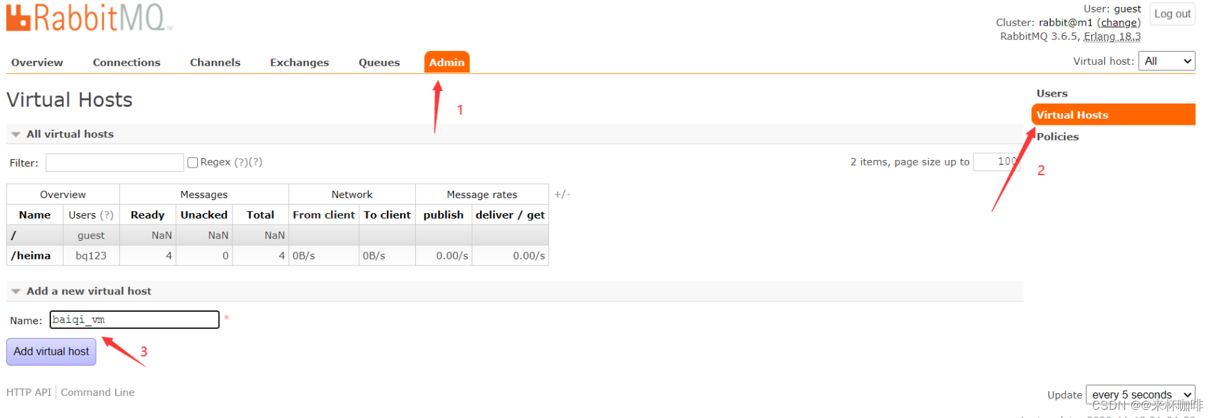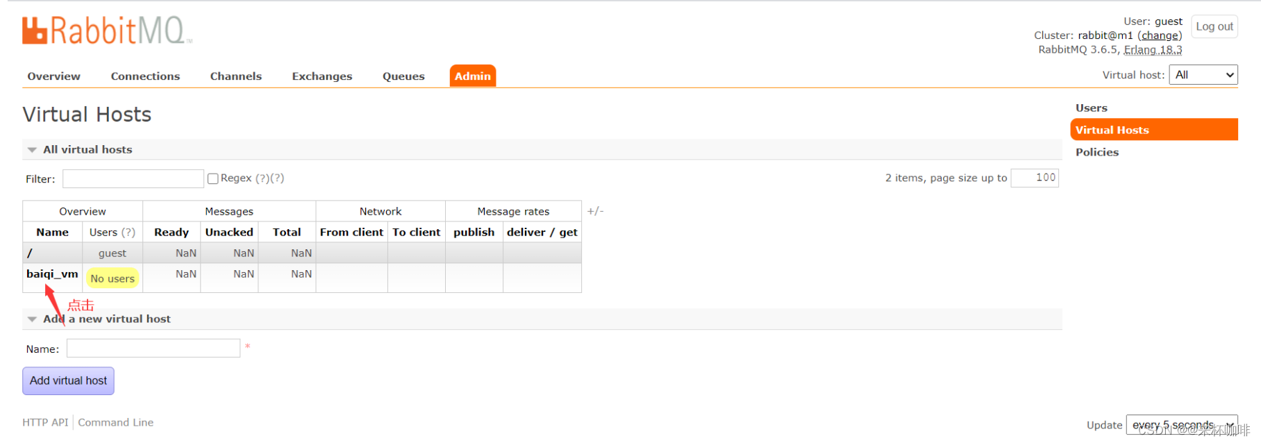 RabbitMQ 也有类似的权限管理;在 RabbitMQ 中可以虚拟消息服务器 Virtual Host,每个 Virtual Hosts 相当于一个相对独立的 RabbitMQ 服务器,每个 VirtualHost之间是相互隔离的。 exchange 、 queue 、 message 不能互通。 相当 于mysql 的 db 。 Virtual Name 一般以 / 开头。