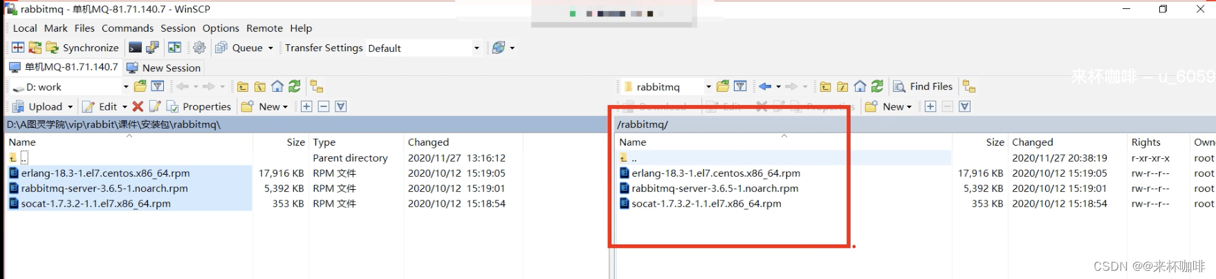 在根目录“/”下,建立rabbitmq文件夹(其实在哪建立都可以);然后将三个安装包上传到给目录: