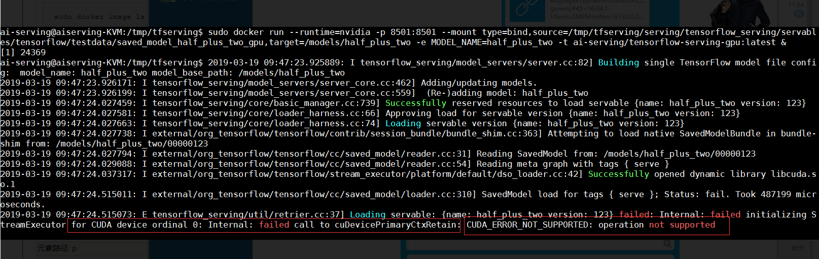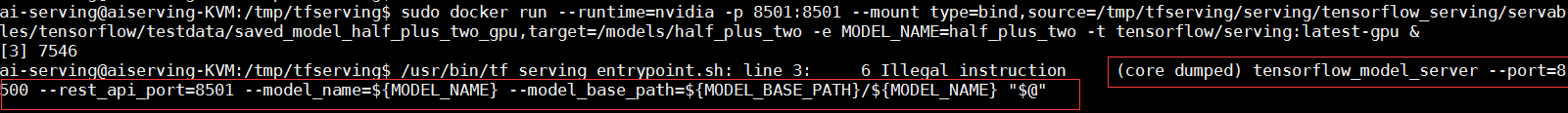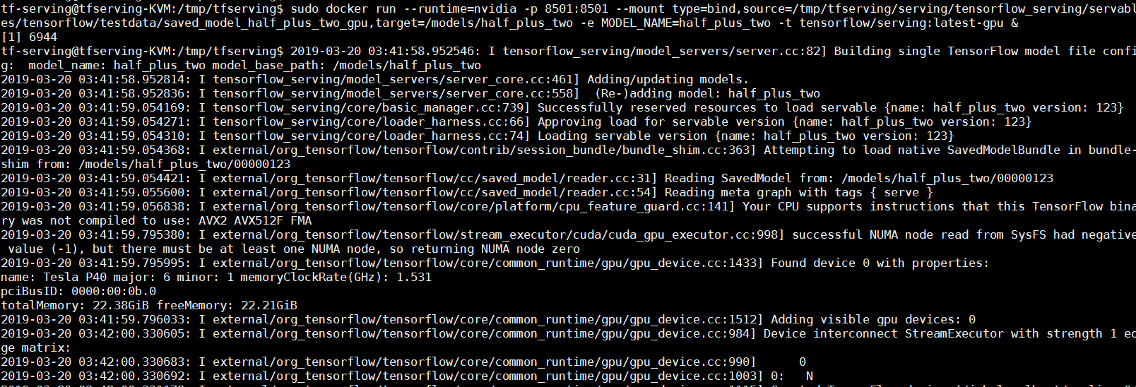 docker run --runtime=nvidia -p 8501:8501 \ --mount type=bind,\ source=/tmp/tfserving/serving/tensorflow_serving/servables/tensorflow/testdata/saved_model_half_plus_two_gpu,\ target=/models/half_plus_two \ -e MODEL_NAME=half_plus_two -t tensorflow/serving:latest-gpu &
