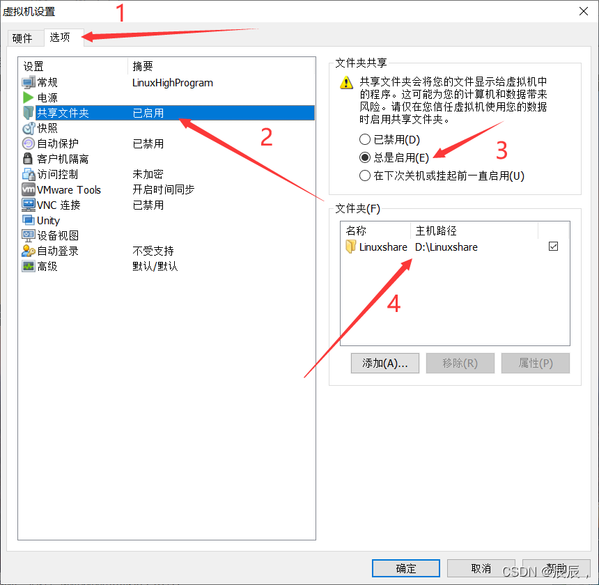 2. 点击设置–>选项–>共享文件夹–>总是启用–>添加共享内存路径