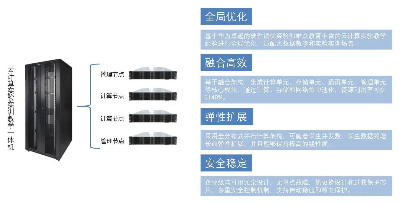云计算实训一体机是唯众针对云计算教育领域推出的一款创新产品,它基于华为机架服务器进行了深度的调优设计。这款产品融合了软硬件技术,不仅体现了云计算技术的先进性,也充分满足了教育实训的需求,是一款专为云计算教育设计的软硬件融合产品,它内置了企业级虚拟化管理系统和实训教学信息化平台,通过软硬件结合调优提升了处理能力。同时,它还支持海量数据处理与分析以及按需分配计算与课程资源等功能,为云计算教育提供了全面、高效、稳定的解决方案。