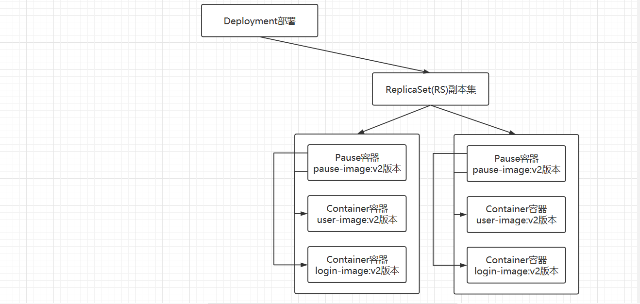 如果一个旧的应用运行了两个实例,如果此时想更新该应用,比如,此时旧的应用就是左边的两个POD,如果更新这个应用的时候,一般我们更新的就是Deployment,Deployment会自动的帮我们再创建一个ReplicaSet(RS),创建一个副本集,会滚动先启动一个新版本的POD,例如升级了镜像的版本,副本集先启动了一个实例,此时Deployment管理的是三个实例,对外提供服务的是三个实例,新的实例启动完成以后,健康检查通过以后,Deployment会控制旧的ReplicaSet(RS)去先停止一个旧的POD,将这个旧的POD删除掉,此时,提供服务的是一个新版本,一个旧版本哦,旧版本的POD下掉以后,新的ReplicaSet(RS)会通过新的POD再创建一个新的POD实例,新启动的POD实例也会被ReplicaSet(RS)管理起来,新启动的第二个POD通过健康检查以后,会让旧的ReplicaSet(RS)将剩下的这一个POD停止掉,停掉以后,将旧的ReplicaSet(RS)清理掉,此时整个服务更新的过程就完成了,就进行了滚动部署。