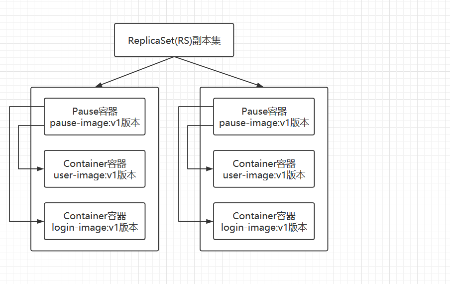 4)、ReplicaSet(RS):POD的上一层是RS,叫做副本集。同一个应用下,要运行几个实例呢,ReplicaSet(RS)负责管理这个的。ReplicaSet(RS)可以管理多个POD的。运行过程中,如果某一个POD出现异常或者异常退出,ReplicaSet(RS)会保证副本始终为2,在另外一台机器重新调度起来一个。