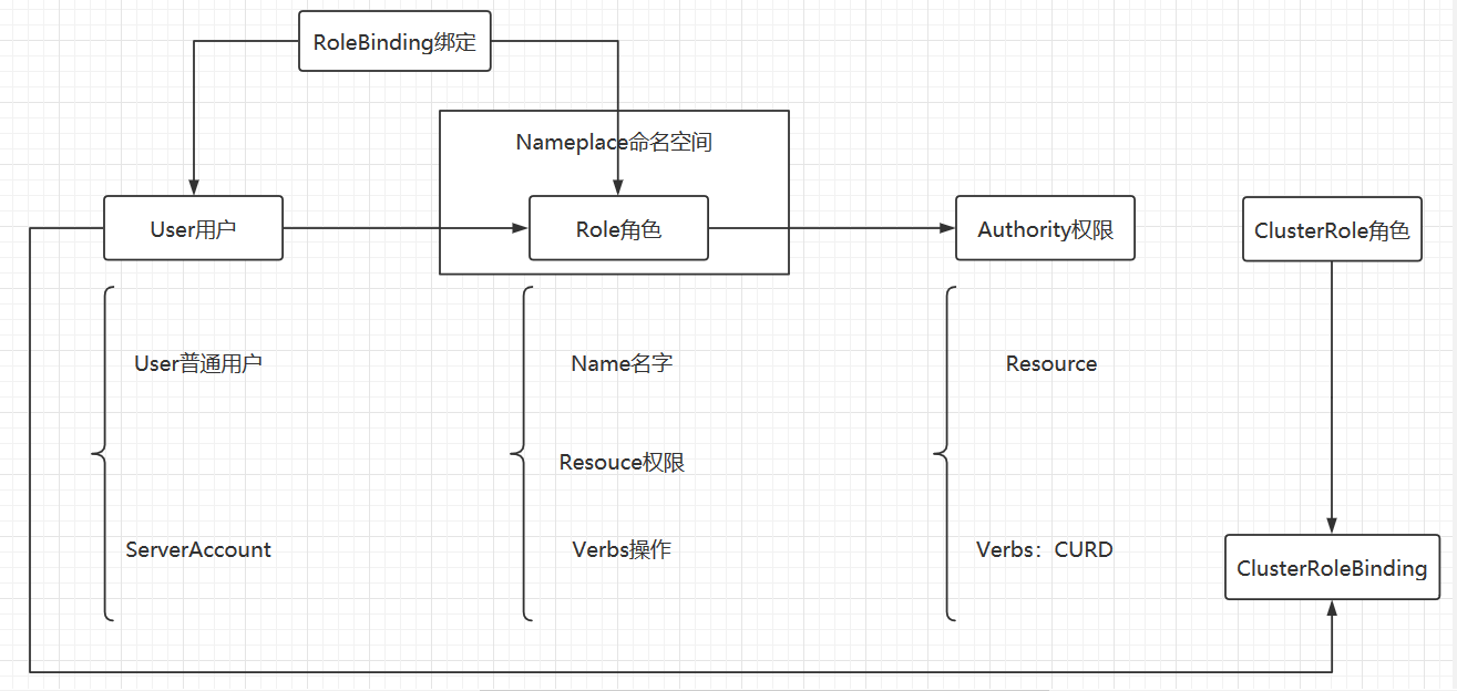 1)、用户层面:两种User用户,一种是普通的User用户,比如kubectl去访问ApiServer的时候,都属于普通的user用户。另外一种用户是ServerAccount,专门用于在集群内部去访问ApiServer的。