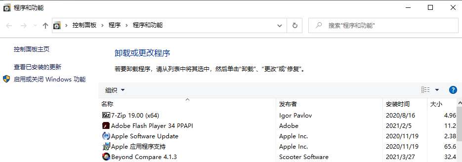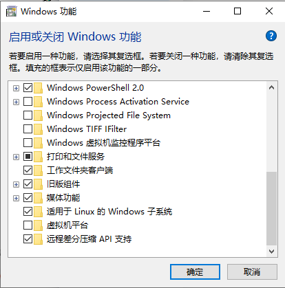 可以看到:【适用于 Linux 的 Windows 子系统】这一栏已经被勾选了,说明 WSL 服务已经启动。