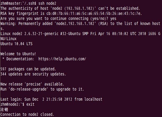 即在单机结点上用ssh进行登录,看能否登录成功。登录成功后注销退出,过程如下: