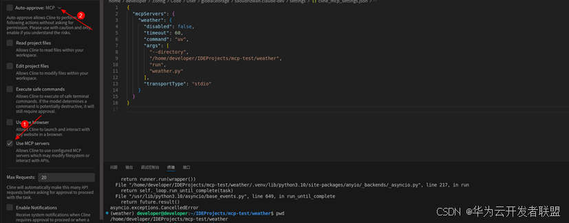⑤ Cline插件配置Mcp Server服务并调用Mcp Server提供的工具。