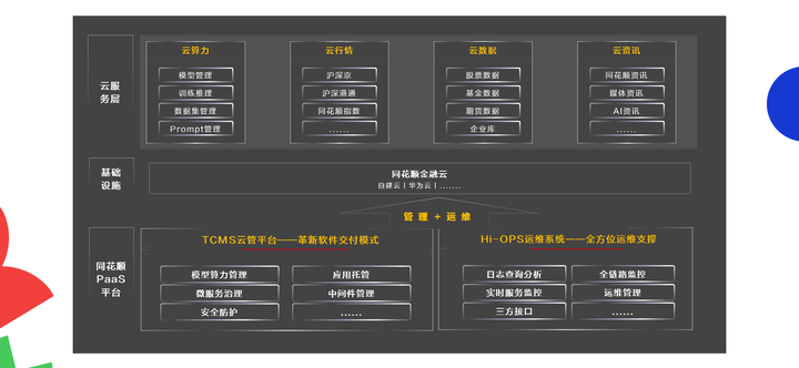 针对以上问题,同花顺与华为云依托长期深度适配经验,打造出了融合创新的整体架构:系统核心采用鲲鹏云服务器、HCE操作系统、GaussDB数据库及CCE容器化平台,实现从芯片到应用的全栈自主创新。同时,整合同花顺自建云与华为鲲鹏云,形成统一资源池,提供云行情、云数据、云资讯等SaaS化服务。通过同花顺自主创新的TCMS云管平台与Hi-Ops运维系统,实现对混合环境(包括本地机房及华为云CCE)的统一纳管与高效运维。