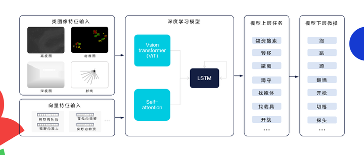 游戏AI智能体在规则驱动时代,较为依赖人工策划编写决策树,一般仅支持跳棋、五子棋等简单场景,灵活性低;在机器学习驱动时代(2019-2023年),超参数GameAIBot通过深度学习+强化学习,同时处理游戏环境的多模态特征(类图像视觉信息+向量数据特征),采用Vision Transformer及Self-Attention时序网络,实现对战场态势的时空建模,直接生成与人类玩家一致的动作指令(移动/开火/跳跃等),完成从感知到决策的闭环训练。在大语言模型融合时代(2023至今),超参数基于大语言模型技术,在AIBot中加入对话、语音能力,利用LLM的思考能力,助力AI更强大决策智能。