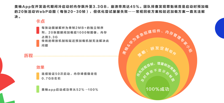 在性能调优中,双方专家团队发现APP冷启动时因同时加载20张动图(每图30帧),导致内存峰值飙升至3.3GB、崩溃率达45%。传统延迟加载方案失效后,联合开发定制化动图组件,实现首帧优先加载机制;增量帧按需加载算法;实时释放非显示帧资源。内存占用从3.3GB降至7MB以内,启动成功率提升至100%,峰值内存稳定控制在700MB左右。
