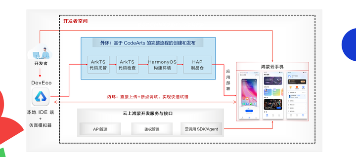开发者可直接连接云端鸿蒙设备进行应用调试,同步集成CodeArts实现云端编译构建与CI/CD流水线。