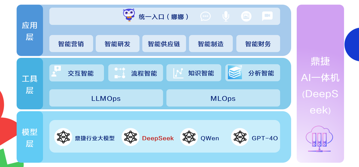 应用层:开发ChatFile(智能问答)、Chat BI(结构化数据查询)及流程智能体,实现非侵入式传统软件赋能。目前,鼎捷AI采购助手与ChatFile也已在全国范围成功拓展。