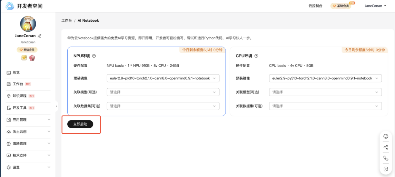 例如:我们选择 euler2.9-py310-torch2.1.0-cann8.0-openmind0.9.1 然后,点击立即启动,