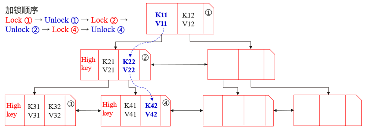 首先,查询事务会锁住根节点①,然后,利用二分查找找到<K11, V11>。接着,事务会先释放节点①的锁,再锁住节点②,再利用二分查找找到<K22, V22>。紧接着,事务会先释放节点②的锁,再锁住节点④,最后通过二分查找找到目标值<K42, V42>后,再释放节点④的锁。